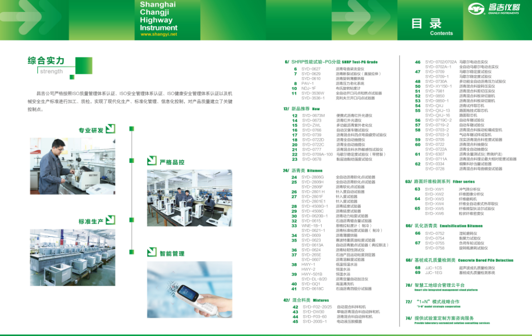 《2022年上海昌吉沥青及混合料检测仪器宣传册》正式发布啦。新版宣传册共80页,涵盖了企业发展历程简介、企业荣誉、综合实力展示、服务理念、PG分级产品、新品及其它产品精美展示、智慧工地项目、1+N模式战略合作、实验室定制方案等多个板块内容。系统并完整的介绍了上海昌吉近些年来在沥青及混合料检测设备方面的技术突破。及针对客户的需求,制定了不同的市场策划方案。