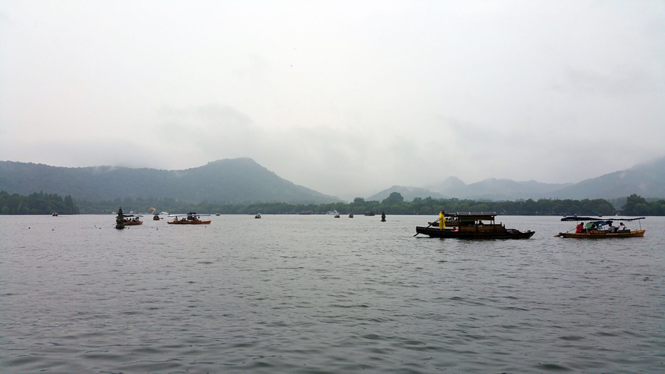 因下雨临时改变行程,第三天上午去杭州游西湖。雨中的西湖被一层薄纱罩着,宛如少女般的羞涩。