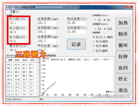 2、仪器设计有三路测力装置,一次试验即可实现三个试样的延度、拉力测试,一气呵成,实现延度测试的最新研究方向。